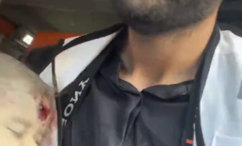 Palestinian journalist sitting in the front seat of an ambulance in Gaza; We counted as an ambulance, suddenly people came and stopped us and gave me this little martyr girl.